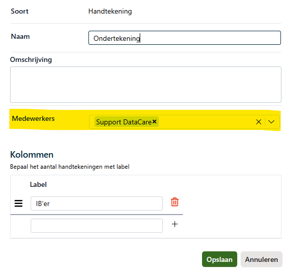 In een template kan er vervolgens gekozen worden bij de definitiesoort Handtekening een of meerdere medewerkers te selecteren.