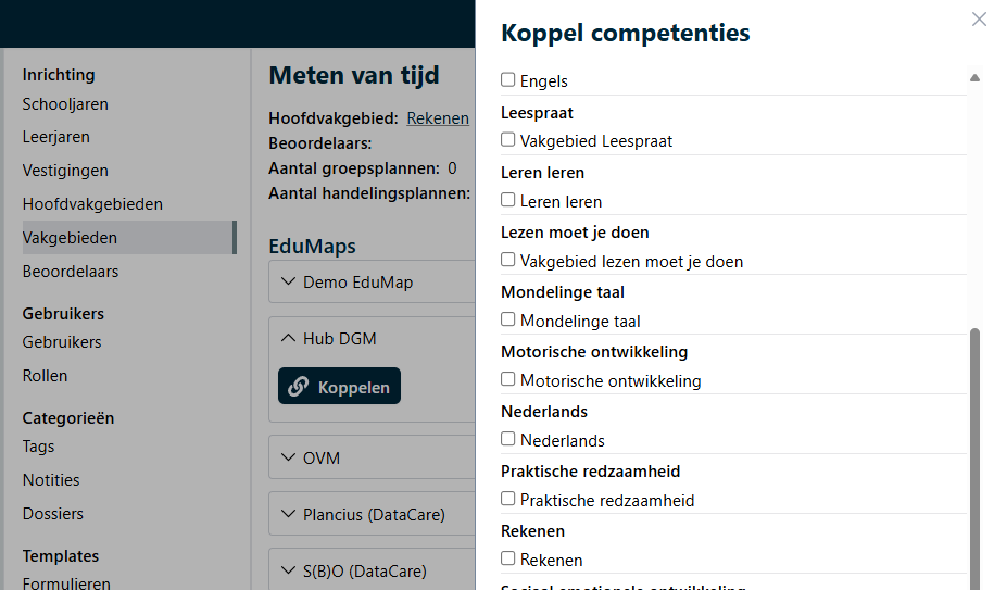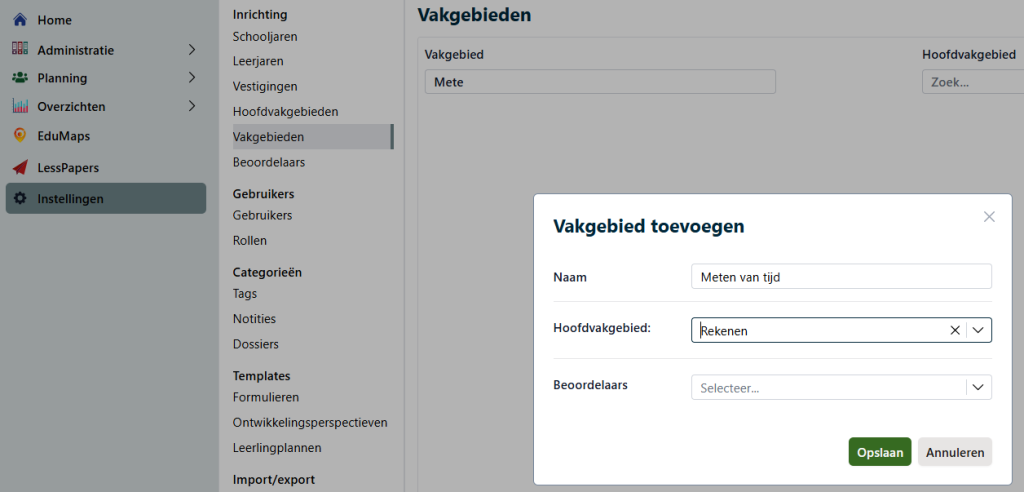 In onderstaand voorbeeld voegen we een vakgebied Meten van tijd toe en deze koppelen we aan het hoofdvakgebied Rekenen.