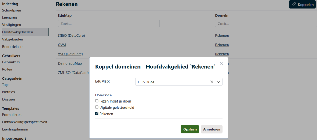 Selecteer het hoofdvakgebied – kies voor Koppelen – Kies de EduMap en koppel het domein.