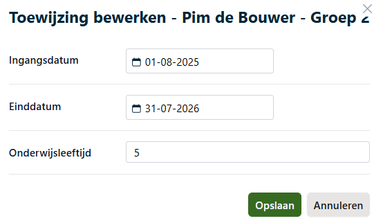 De toewijzing van een leerling die aan een klas gekoppeld is kun je bewerken.
