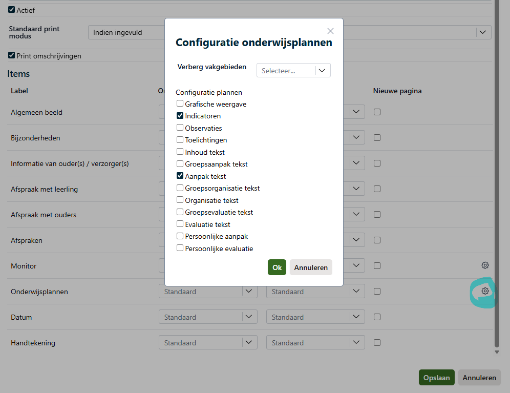Kies je Onderwijsplannen dan bepaal je via Prints wat er in de print mee komt via het tandwieltje.