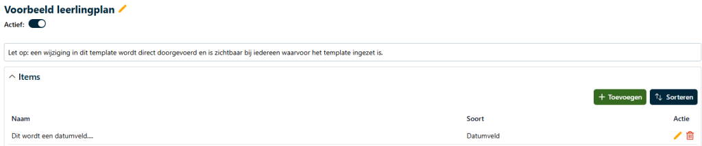 Voeg vervolgens meer items toe. Herhaal dit totdat het template goed is. Later aanpassen is mogelijk, maar wijzigingen zijn direct voor iedere leerling die gebruik maakt van het template zichtbaar.